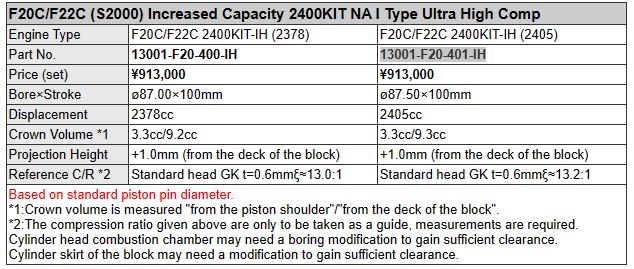 Stroker kit Toda Racing pour Honda S2000 moteur F20C/F22C - 13001-F20-400-IH/ 13001-F20-401-IH
