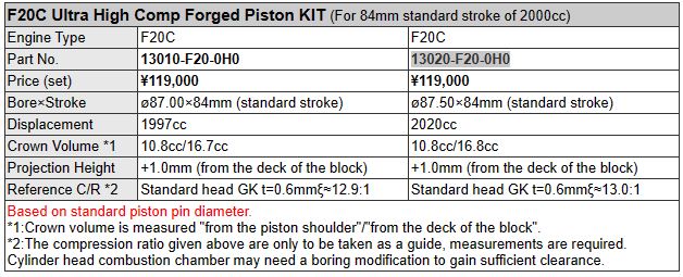 Diamètre standard du piston de F20C : 84 mm