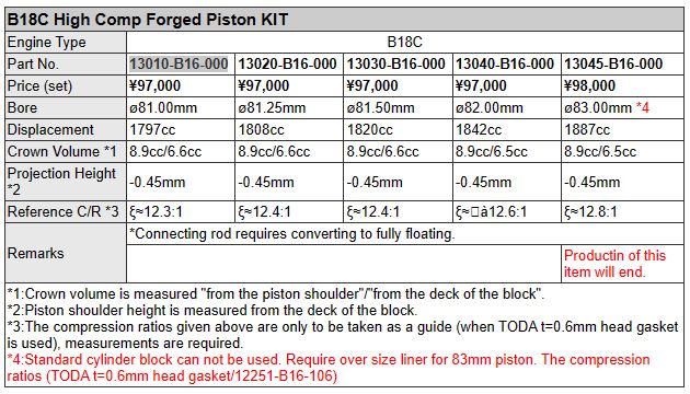 4*: Le bloc-cylindres standard ne peut pas être utilisé. Nécessité d'une chemise surdimensionnée pour un piston de 83 mm. Les taux de compression (TODA t=0,6mm joint de culasse/12251-B16-106). Ce produit sera bientôt discontinué