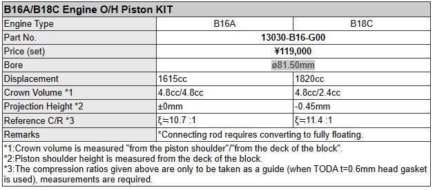 Le moteur Honda de la série B est toujours très populaire dans le monde entier et compte de nombreux adeptes. Comme la majorité de ces moteurs ont un kilométrage élevé, les clients peuvent s'inquiéter de leur état. Toda Racing a développé un kit de piston de révision (O/H) spécialement pour ces moteurs. Conçu avec une jupe plus longue que celle du piston haute compression standard et une légère augmentation du taux de compression par rapport au Honda standard. Il s'agit donc d'un piston plus facile à remplacer que la plupart des pistons du marché secondaire.