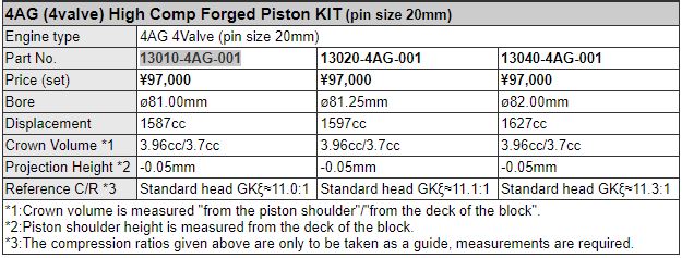 Pistons forgés haute compression Toda Racing pour Toyota Levin, Trueno moteur 4AG 4 soupapes - 13010-4AG-001/ 13020-4AG-001/ 13040-4AG-001