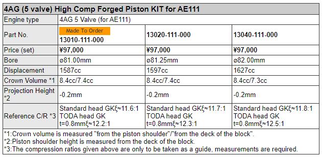 Pistons forgés haute compression Toda Racing pour Toyota AE111 Levin, Trueno moteur 4AG 5 soupapes - 13010-111-000/ 13020-111-000/ 13040-111-000