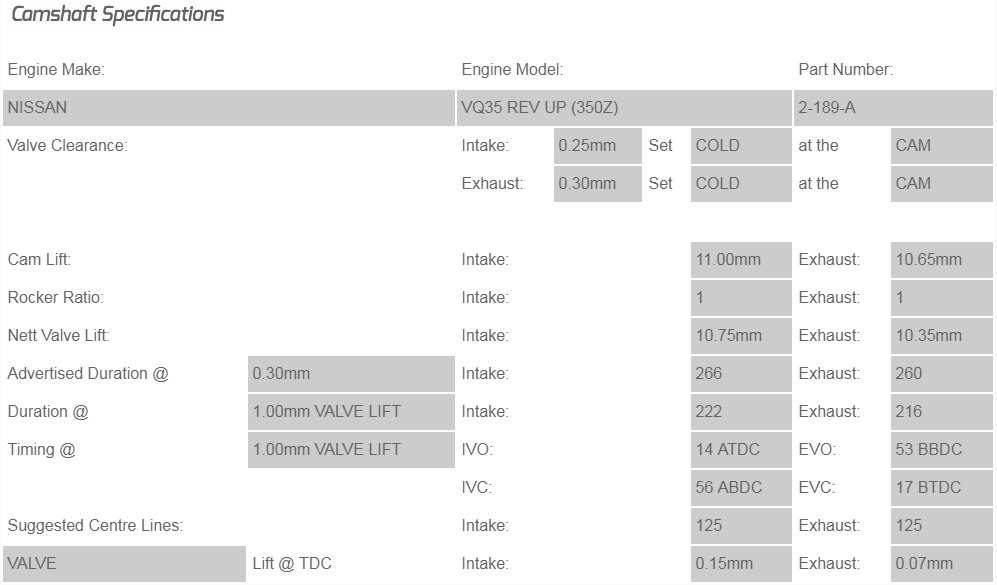 Set arbres à cames admission et échappement Stage 1 266° et 260° Kelford pour Nissan 350Z Z33 VQ35DE Gen 1 - 2-189-A