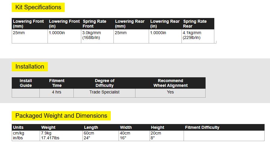 Les ressorts Whiteline permettent d'améliorer les performances du véhicule tout en maintenant les caractéristiques de sécurité et de qualité de roulement. Ce kit contient des ressorts avant de 3.0kg/mm (168lb/in) qui fournissent un abaissement de 25mm tandis que les ressorts arrière de 4.1kg/mm (229lb/in) fournissent un abaissement souhaitable de 25mm au véhicule.