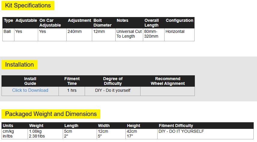 Whiteline a développé des biellettes de barre stabilisatrice universels intelligents, coupés à la longueur, avec une rotule de 12 mm et une plage de réglage de 80-320 mm c/c. Un seul numéro de pièce couvre des centaines d'applications.